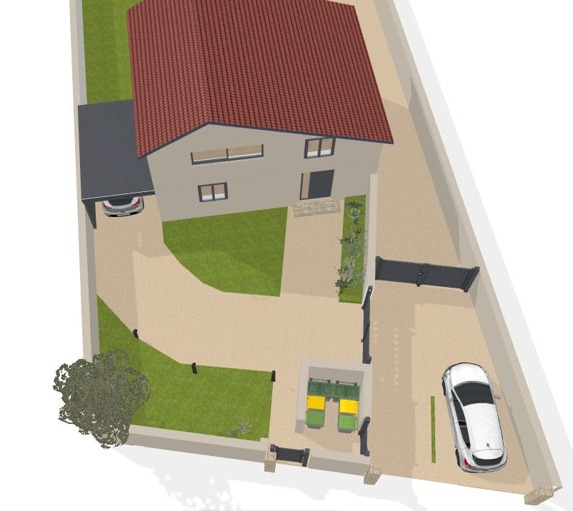 Vue de dessus projetée en 3D de l’aménagement de l’avant de la propriété :