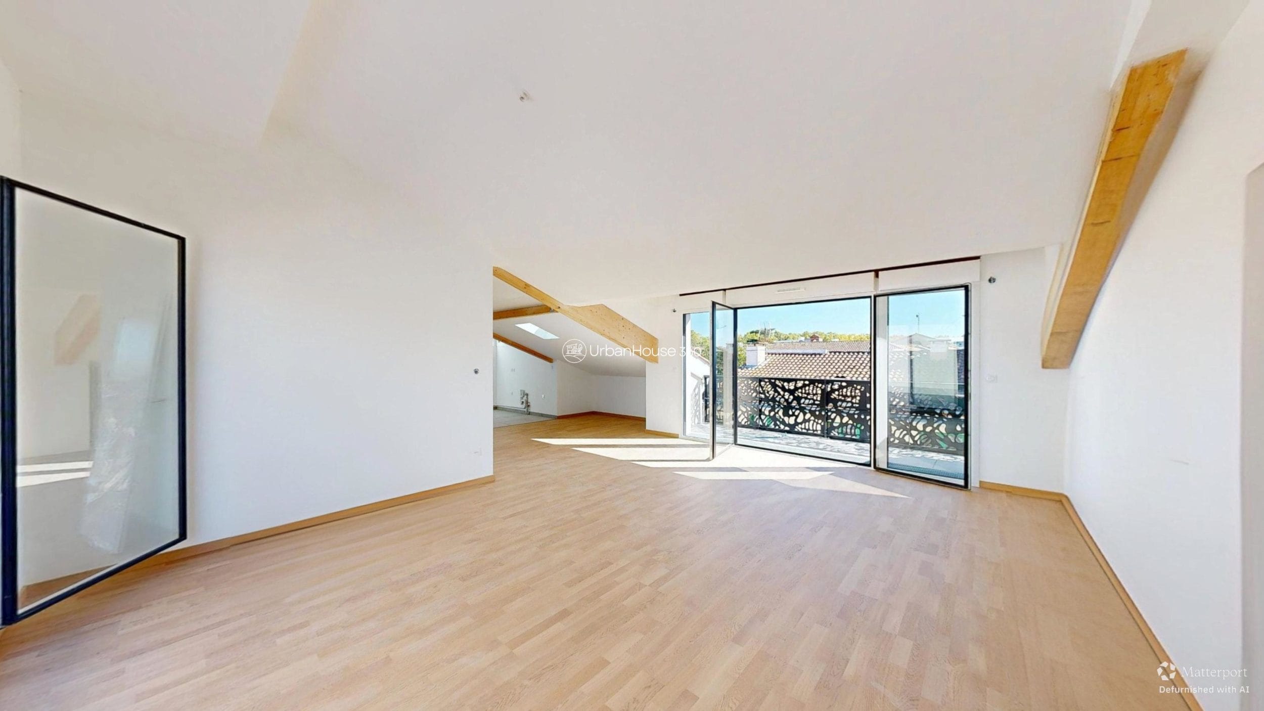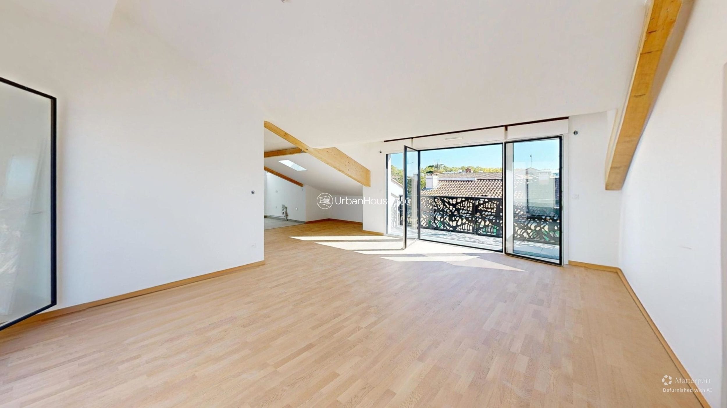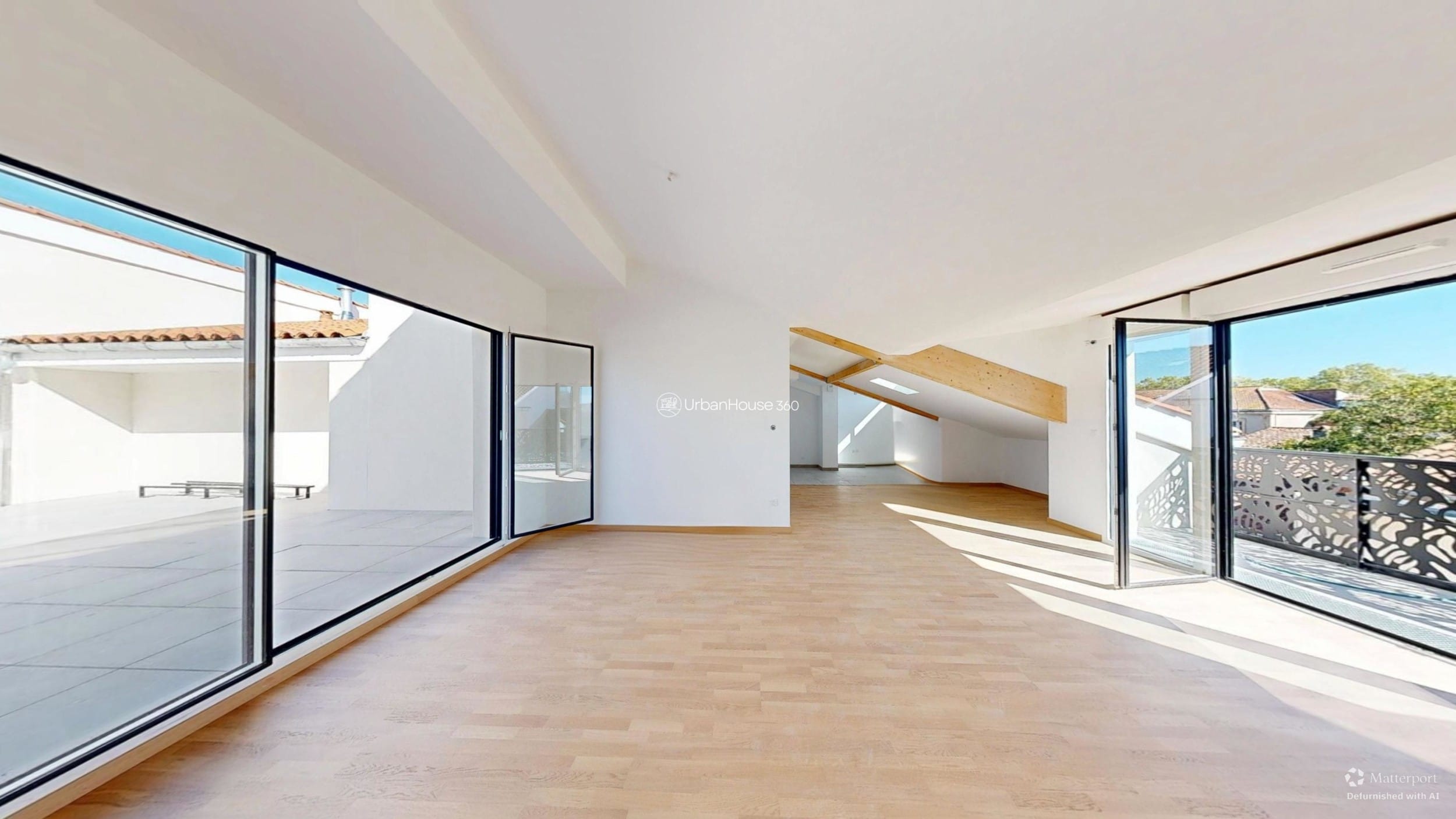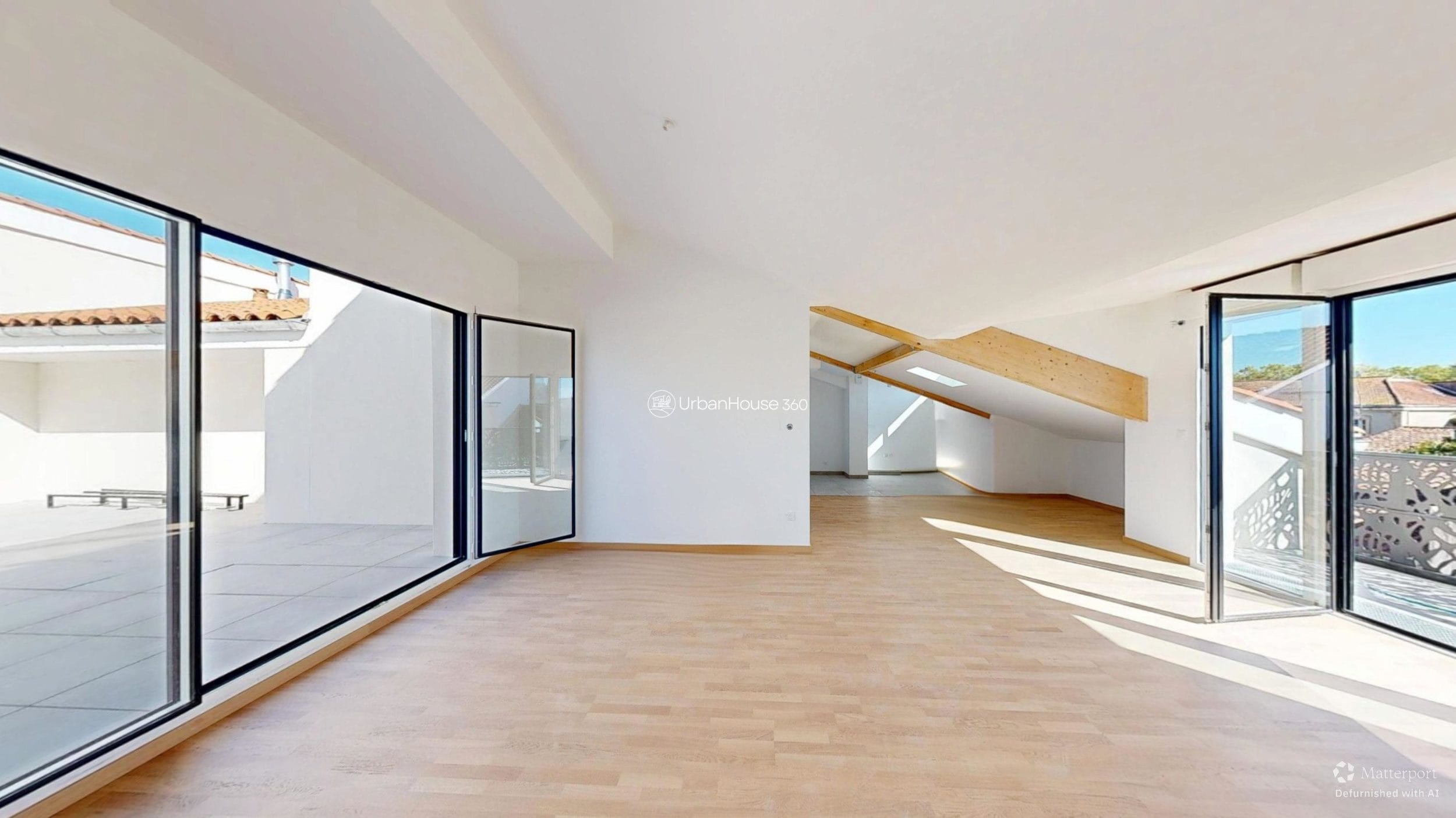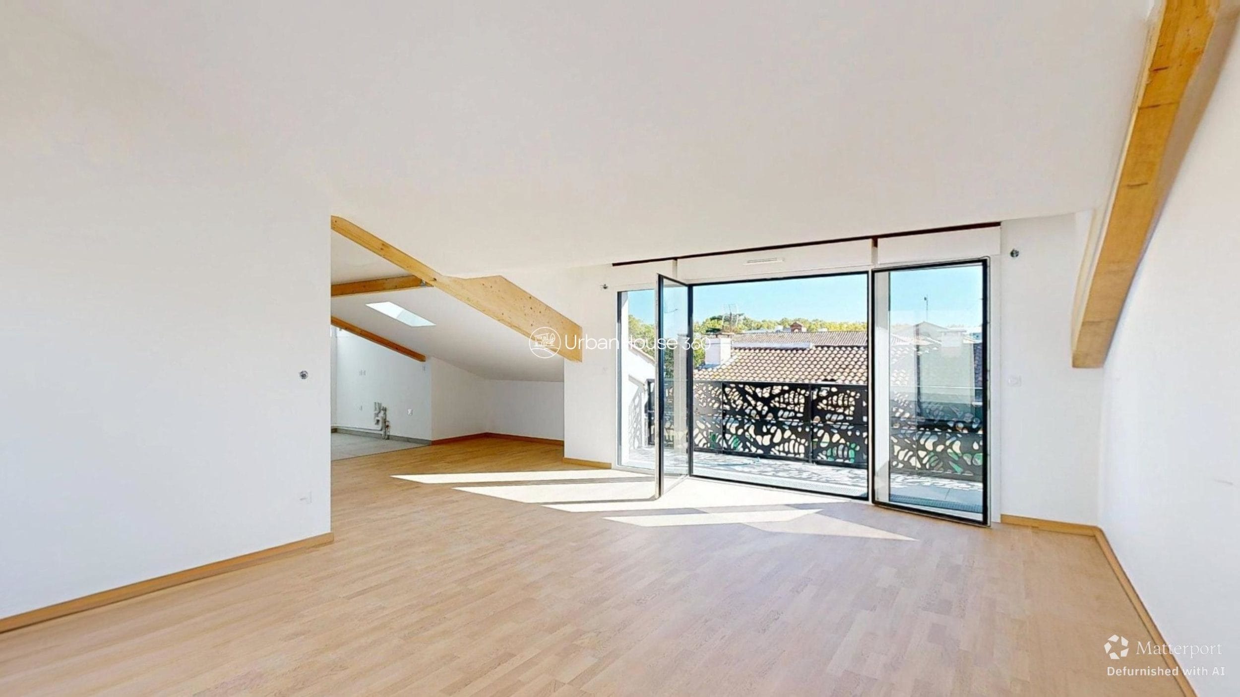 La lumière traverse l’espace, glissant sur les poutres apparentes, révélant la douceur du parquet, ouvrant l’horizon sur le ciel bleu toulousain.